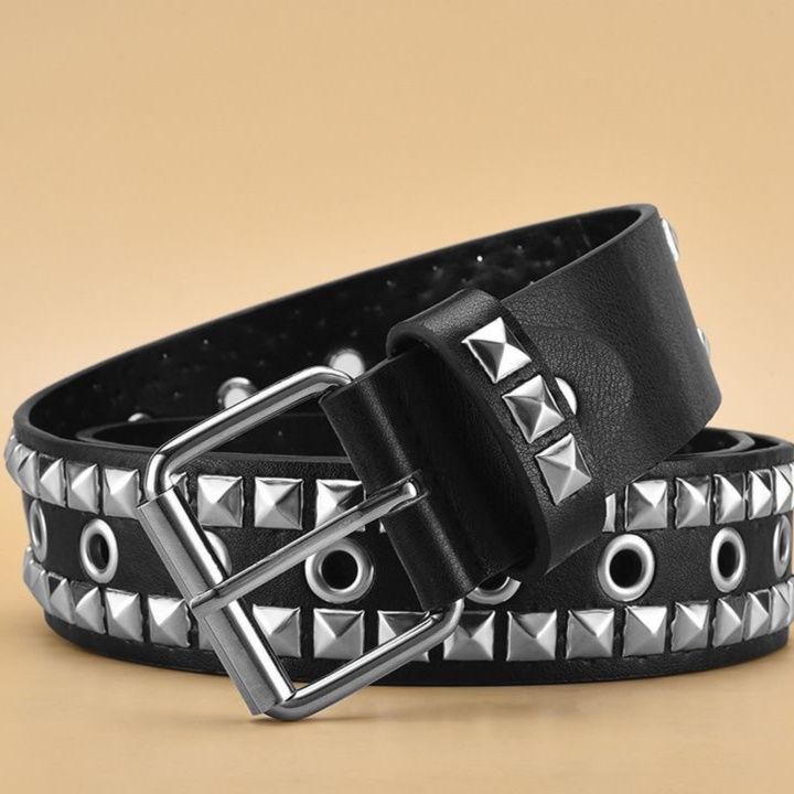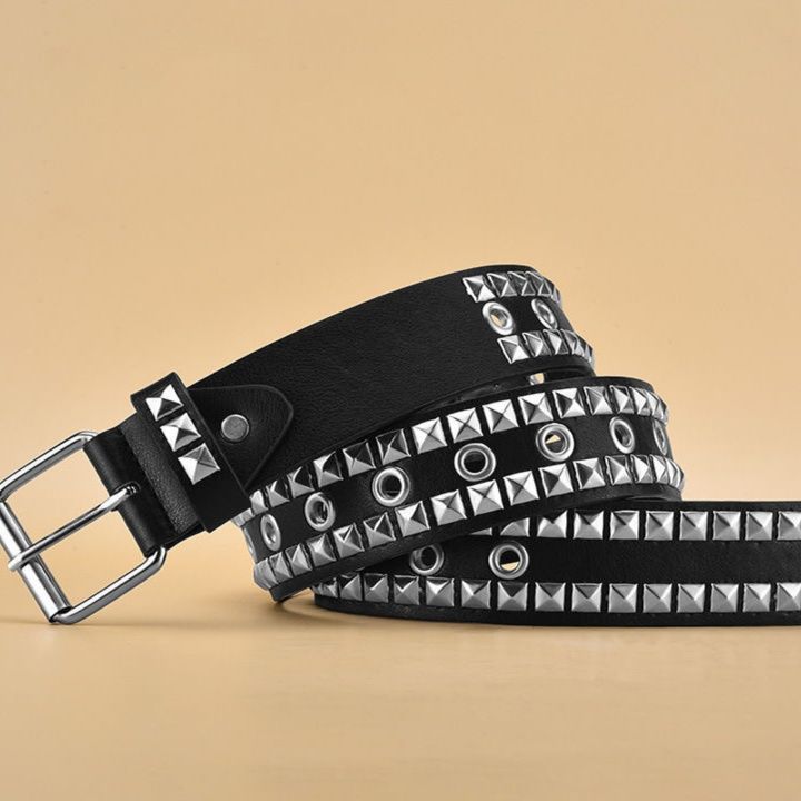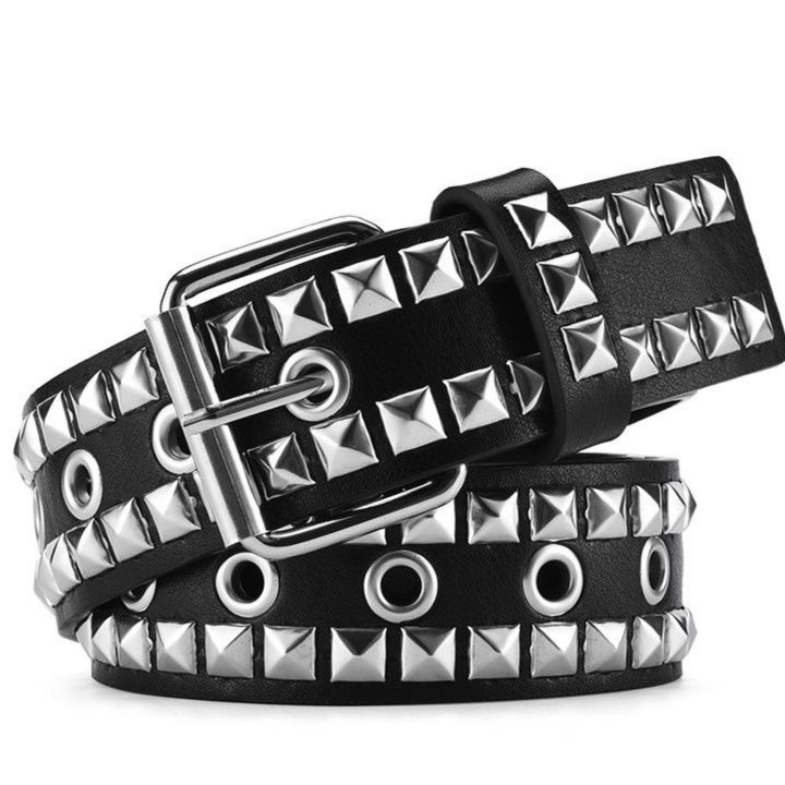 革の表面に配置されたピラミッド型のスタッズと円形のハトメが存在感を放ち、ロックテイストな雰囲気を醸し出します。