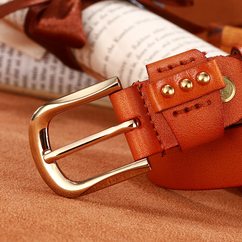 バックル部分には真鍮素材を採用し、ベルト通し部分には装飾的な鋲をあしらいました。