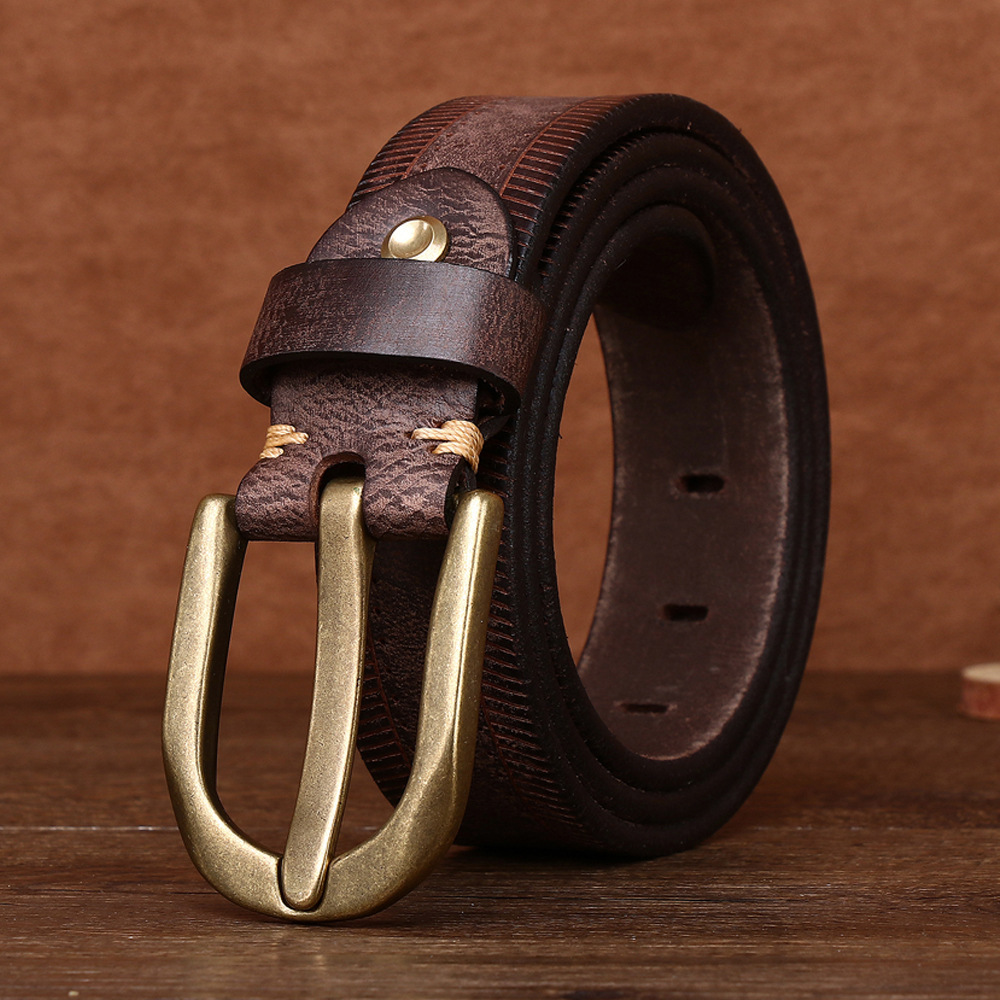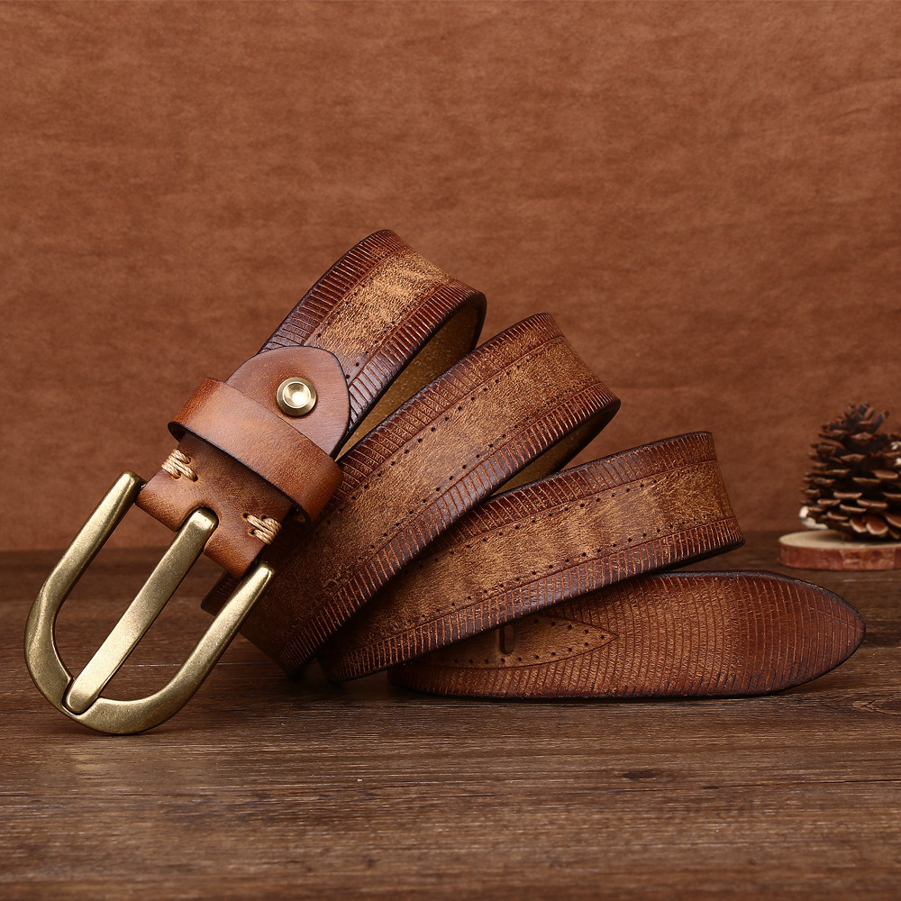上質な革を使用したメンズベルトです。 表面には細やかな型押し加工が施され、独特の質感と高級感を演出しています。 二重ピンのバックルは真鍮風の仕上げで、クラシカルな雰囲気を醸し出します。 革ならではの経年変化も楽しめる逸品で、ビジネスからカジュアルまで幅広いシーンで活躍します。 丁寧な縫製と丈夫な作りで長くご愛用いただけるメンズベルトです。